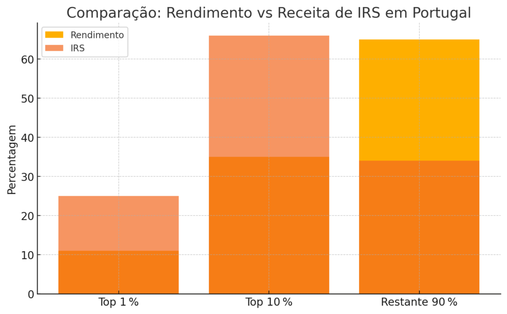 O gráfico comparativo “Distribuição do rendimento vs receita de IRS” já está disponĂvel acima. Mostra, de forma simples, que: